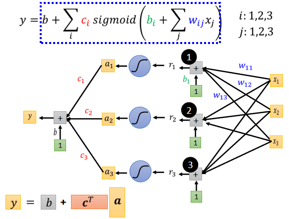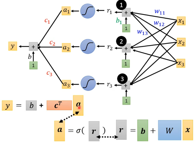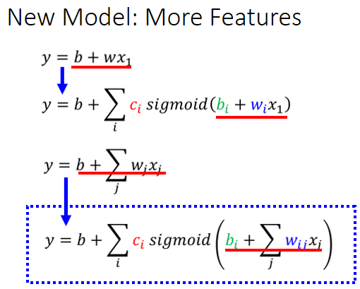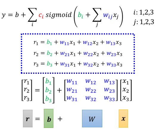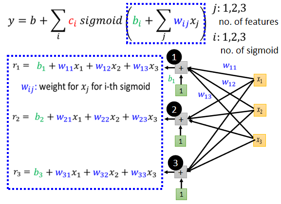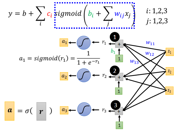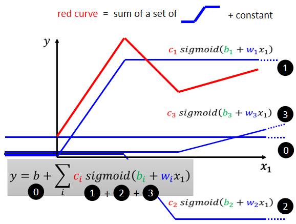 - 每一個 就代表了一個藍色的 function,現在每一個藍色的 function 都用一個 sigmoid function 來近似它