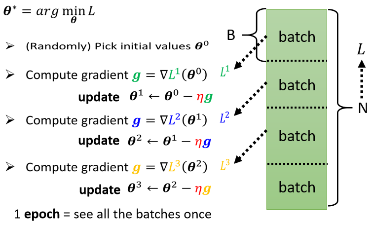 每次更新參數時,只使用 1 個 batch 裡的資料計算 loss,求取梯度,更新參數
