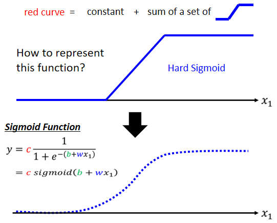 由多段鋸齒狀的線段所組成的線,可以看作是一個常數,再加上若干個藍色的 function(Hard Sigmoid)
