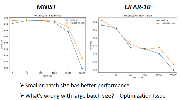 根據 On Large-Batch Training For Deep Learning: Generalization Gap And Sharp Minima 這篇 paper 的實驗結果:可觀察出 training 的時候都很好,testing 時大的 batch 較小的 batch 結果差,代表 overfitting
