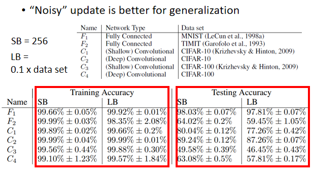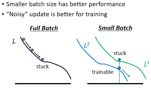 - 大的 batch 是順著規定 update,它就很有可能走到一個比較小的峽谷裡面出不去