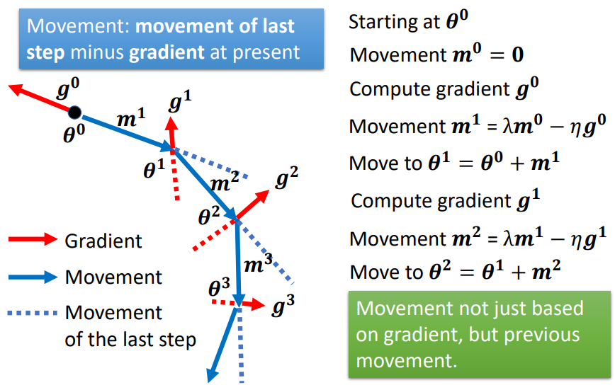 - 使用動量,考慮過去的梯度“大小”與“方向”