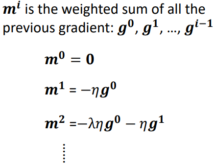 所謂的 momentum 就是 update 的方向不是只考慮現在的 gradient,而是考慮過去所有 gradient 的總合