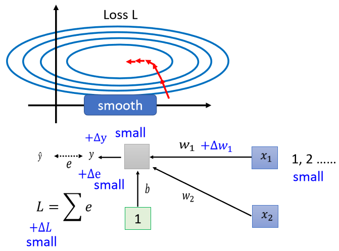 - 因 是乘上 , 當 的值很大時,參數 有變化時,使對 的影響很大,從而對 loss 的影響比較大