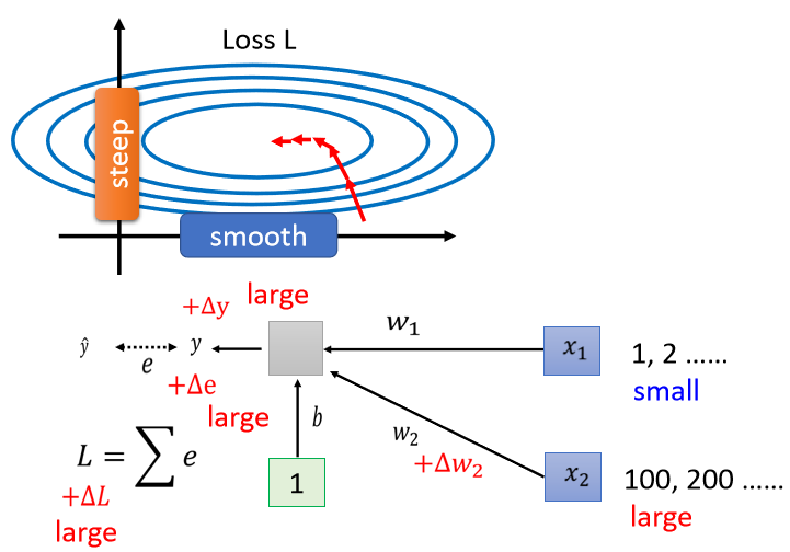不同維度的輸入值 scale 差距可能很大,就會產生在不同方向上,斜率、坡度非常不同的 error surface