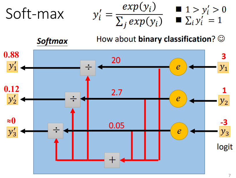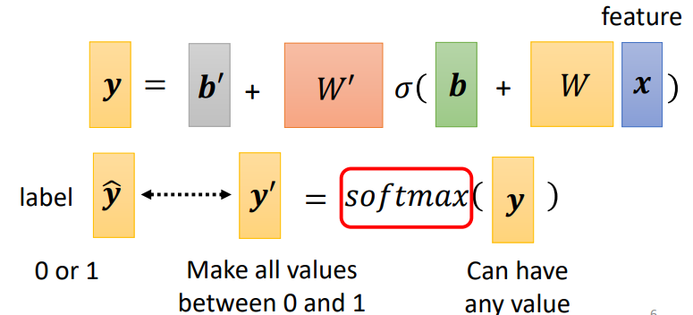 當目標只有 0 跟 1,而 y 有任何值,可使用 softmax 先把它 normalize 到 0 到 1 之間,這樣才好跟 label 計算相似度