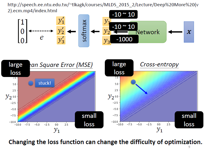 從優化角度出發進行討論,使用 MSE 時,左上角的位置雖然 Loss 很大,但梯度平坦,難以優化;而 Cross-entropy 則更容易收斂 ⇒ 改變 Loss function,也會影響訓練的過程
