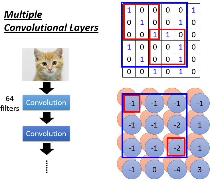 第一層的卷積結果產生了一張 的 feature map。繼續卷積時,需要對 64 個 channel 都進行處理 ⇒ filter 的“高度”要是 64