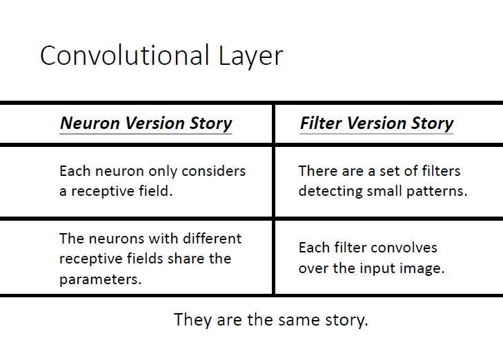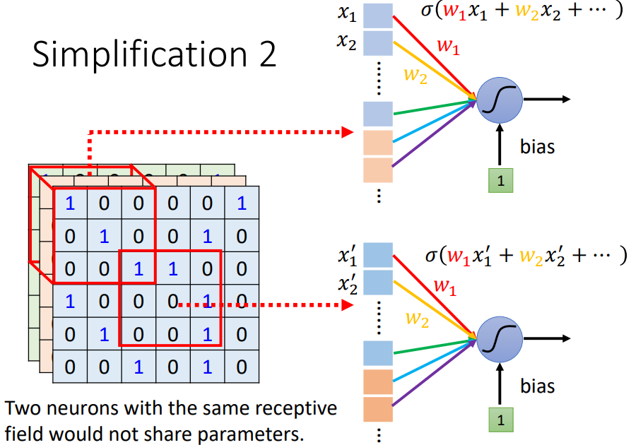 兩個不同 receptive field 的 neurons 有做一樣的工作,就可以共用參數。儘管參數一樣,但因為是不同的 receptive field(不同的輸入),所以輸出也會是不一樣的