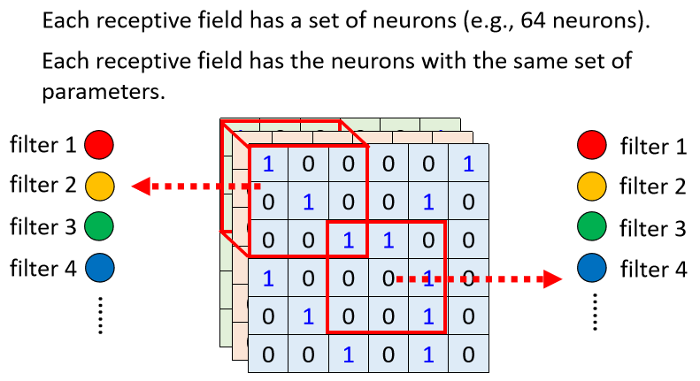 對每個 receptive field,都使用一組神經元處理;這些神經元共用一組參數(weight),此組參數稱作 Filter,因此對不同 receptive field 使用的 Filter 參數相同