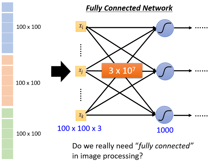 如果輸入的向量長度是 100 × 100 × 3,有 1000 個 neuron,那第一層的 weight 就有 1000 × 100 × 100 × 3,也就是 3×10 的 7 次方,是非常巨大的數目