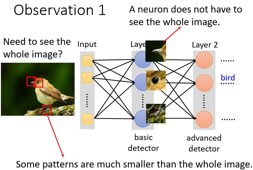 neuron 也許根本不需要把整張圖片當作輸入,只需把圖片的一小部分當作輸入,就足以偵測某些特別關鍵的 pattern 有沒有出現