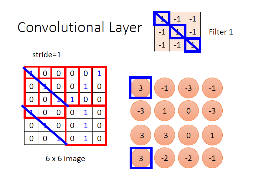 filter 的計算是“內積”:filter 跟圖片對應位置的數值做矩陣乘法,乘完後再將元素相加