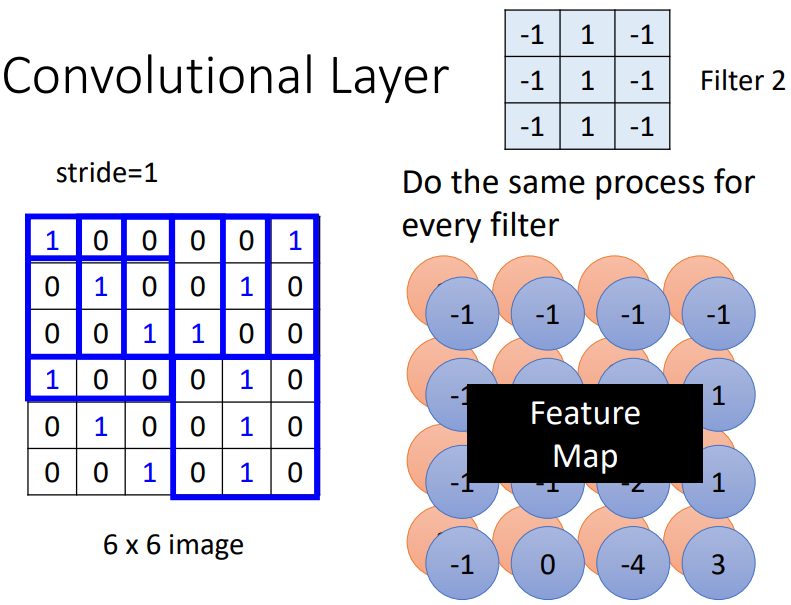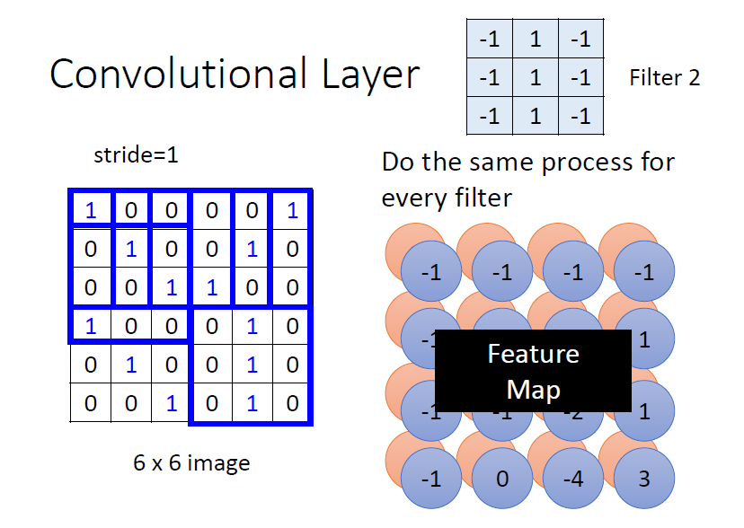 不同的 filter 掃過一張圖片,將會產生“新的圖片”,每個 filter 將會產生圖片中的一個 channel ⇒ feature map