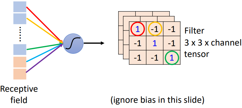 對每個 receptive field,都使用一組神經元處理;這些神經元共用一組參數(weight),此組參數稱作 Filter,因此對不同 receptive field 使用的 Filter 參數相同