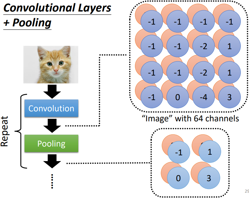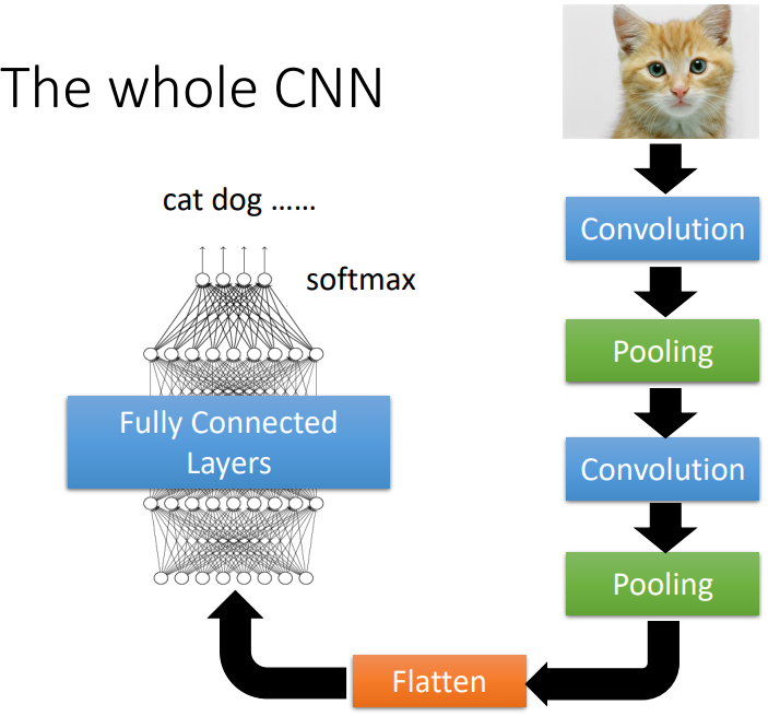 Convolutional Layer → Pooling → ...(循環)→ Flatten(把矩陣拉直排成向量) → FC → Softmax