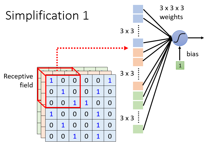 - 一般在做影像辨識的時會看全部的 channel。所以在描述一個 receptive field 的時候,無需說明其 channel 數,只要講它的高、寬 ⇒ kernel size