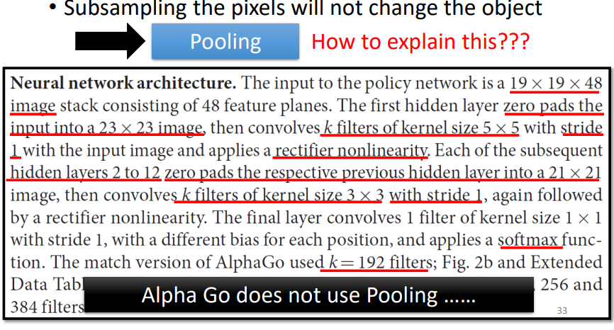 pooling 對於 rerformance 會帶來一點傷害。如果運算資源足夠,現今很多 network 的架構的設計往往就不做 pooling,改為全 convolution