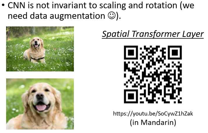 CNN 並不能夠處理影像放大縮小,或者是旋轉的問題。所以在做影像辨識的時候,往往都要做 data augmentation,把訓練數據截一小塊出來放大縮小、把圖片旋轉,CNN 才會做到好的結果