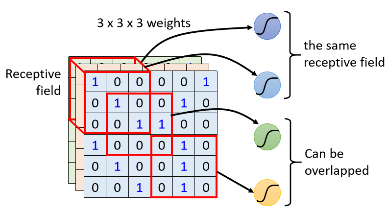- 每個 receptive field 會有不止一個神經元進行守備 ⇒ 輸出通道數/卷積核數目