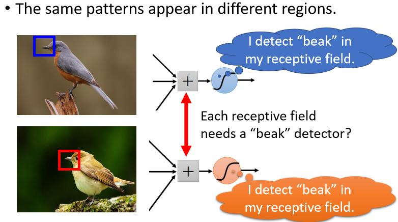 同樣的 pattern,可能出現在圖片的不同位置,偵測同樣 pattern 的神經元做的工作是一樣的,儘管守備的 receptive field 不一樣,但參數會是一樣的