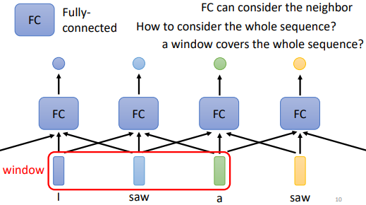 序列的長度有長有短,輸入給模型的序列的長度,每次可能都不一樣。開一個 window 比最長的序列還要長,才可能把整個序列蓋住。但是開一個大的窗口,意味著 Fully-connected network 需要非常多的參數,可能運算量會很大,此外還容易過擬合
