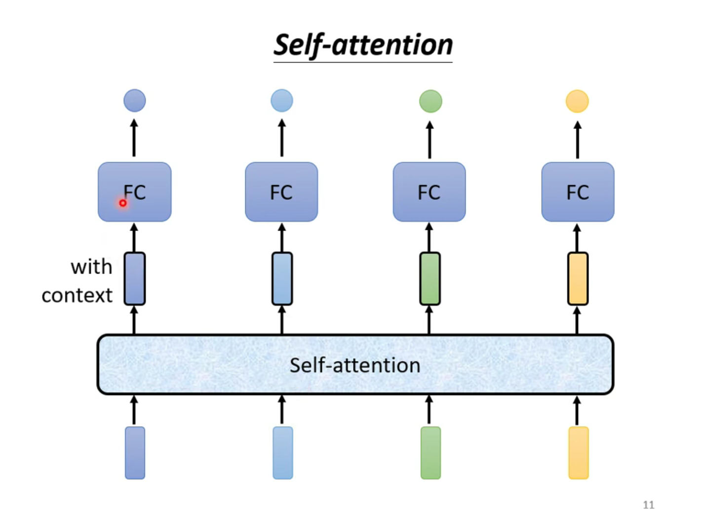 考慮整個序列的所有向量,綜合向量序列整體和單個向量個體,得到對每一個向量處理後的向量,將這些向量個別連接一個 FC,FC 可以專注於處理這一個位置的向量,得到對應結果