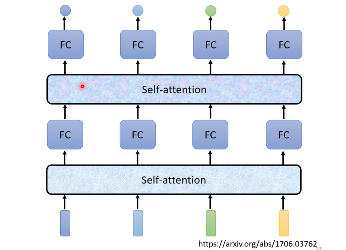 自注意力模型不是只能用一次,可以疊加很多次,與 FC 可以交替使用