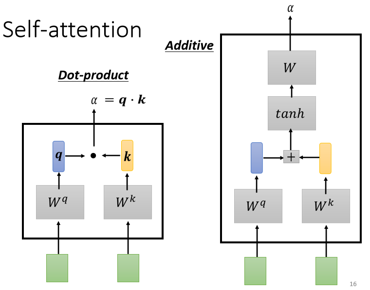 把輸入的兩個向量分別乘上 和 ,得到兩個向量 跟 後做點積,把它們做逐元素(element-wise)的相乘, 再全部加起來得到一個 α