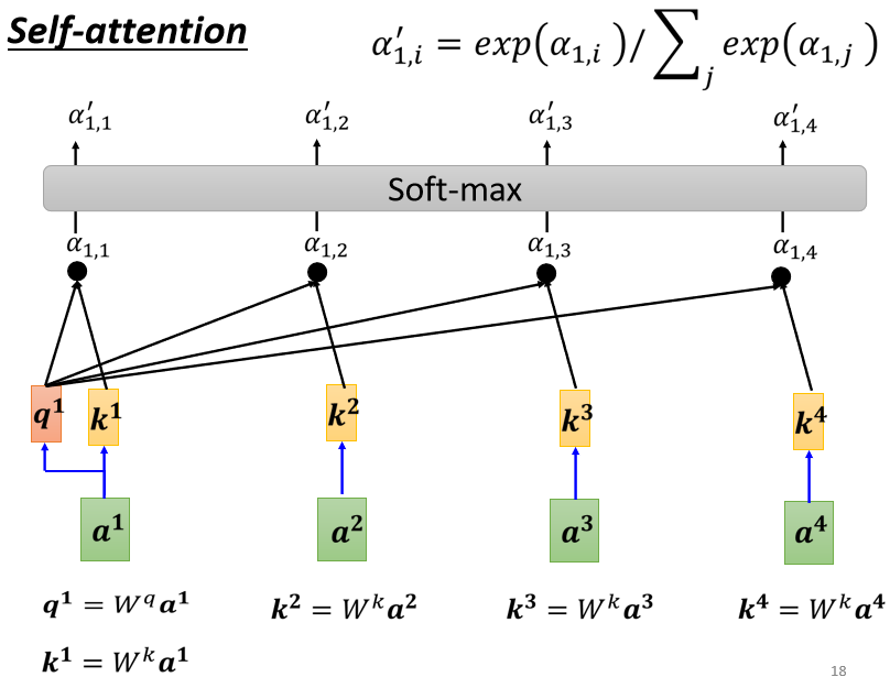 - 計算完 跟其他向量的相關性 後(也必須計算 跟自己的 ),把所有的 經過 softmax (也可使用其他激勵函數,如: ReLu)得到