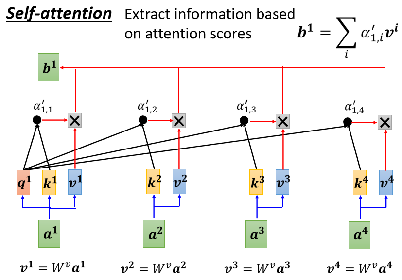 如果 跟 有高相關性,即 的值很大,再做加權和後,得到的 就可能會比較接近 。所以誰的注意力的分數最大,誰的 就會主導(dominant) 抽出來的結果