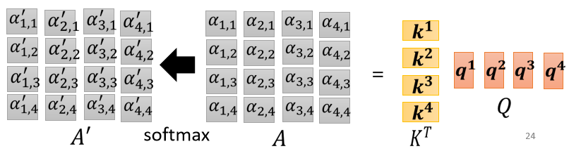 - 接下來 乘上 得到 ,再經過激勵函數得到 稱 Attention Matrix(生成 就是為了得到 attention 的 score)