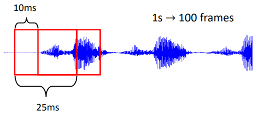會把一段聲音訊號取一個範圍,這個範圍叫做一個窗口(window),把該窗口裡面的訊息描述成一個向量,這個向量稱為一幀(frame)。一小段的聲音訊號,它裡面包含的訊息量非常可觀