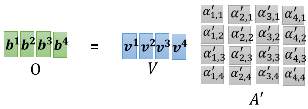 - 將各個 head 計算得到的 拼接,通過一個 transform 得到 然後再送到下一層