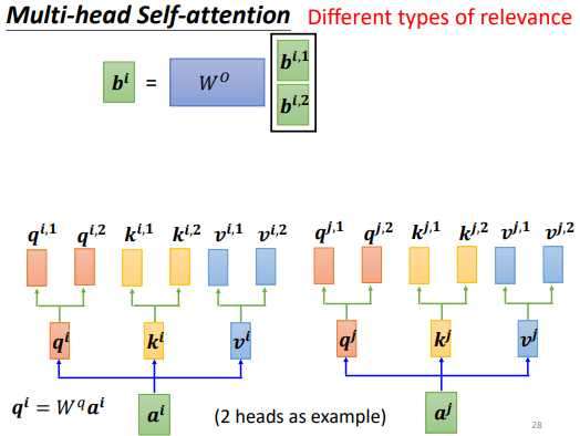 在使用 Self-attention 計算相關性的時,是用 去找相關的 。但是”相關”有很多種不同的形式,所以也許可以有多個 ,不同的 負責不同種類的相關性,這就是 Multi-head Self-attention