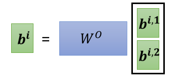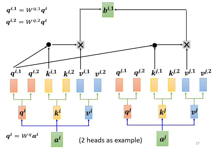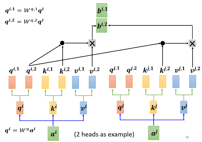 - 再把 乘上另外兩個矩陣,分別得到 跟 ,代表有兩個 head;同理可以得到 , ,