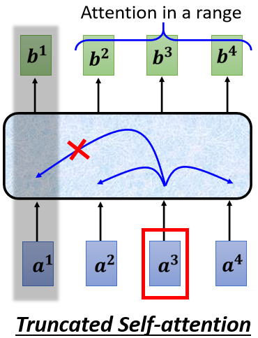 延伸 Self-attention 的概念,運用 Truncated Self-attention。使用 Truncated Self-attention 只考慮一個小範圍語音,而不考慮一整個句子,如此就可以加快運算的速度