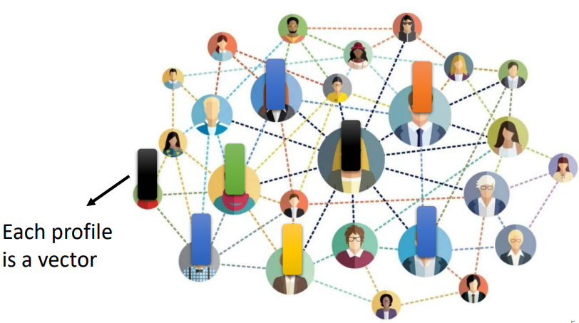 社交網路是一個圖,在社交網路上面每一個節點就是一個人。每一個節點可以看作是一個向量。每一個人的訊息(性別、年齡及工作等等)都可以用一個向量來表示。因此一個社交網路可以看做是一堆的向量所組成