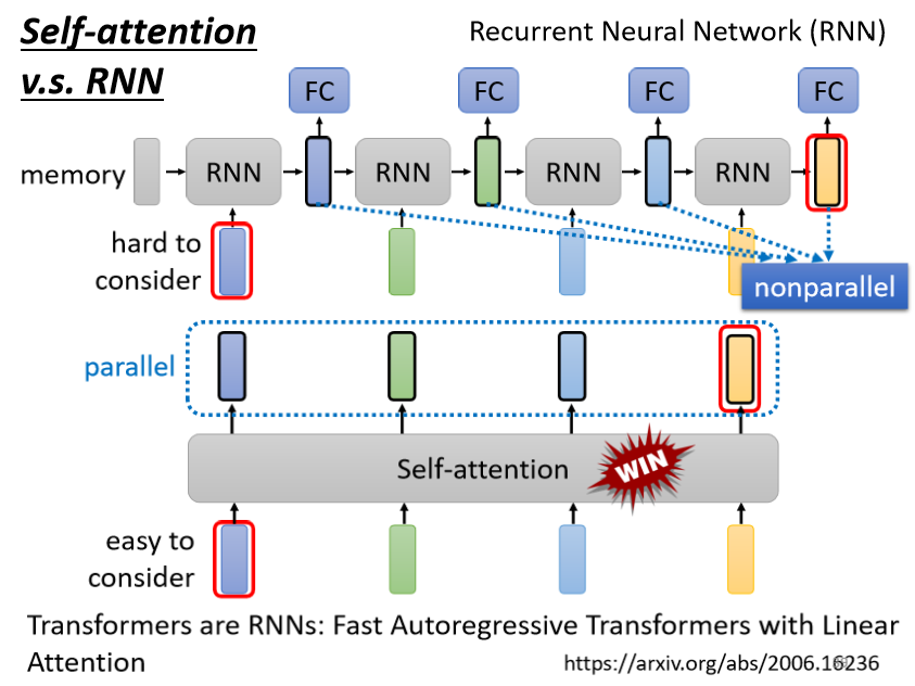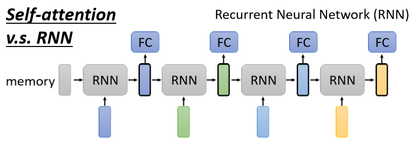 Recurrent Neural Network 跟 Self-attention 做的事情非常像,它們的 input 都是一個 vector sequence,前一個時間點的輸出也會作為輸入丟進 RNN 產生新的向量,也同時會輸入到 FC。很多的應用往往都把 RNN 的架構逐漸改成 Self-attention 的架構