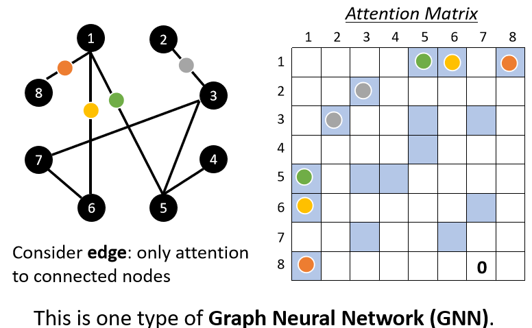 Self-attention 也可以在圖中使用,把 node 當作 vector。然而,圖中的 edge 意味著節點之間的關係,所以我們就可只計算有 edge 相連的 node 的 attention,若兩個 node 之間沒有 edge,代表兩個 node 沒有關係,就不必計算 attention。這種方法也被稱為圖神經網路(GNN)。