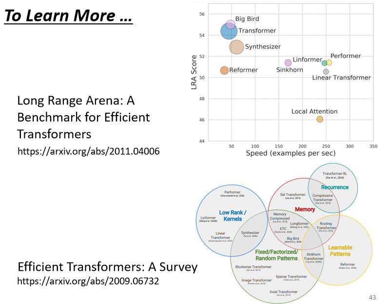 Self-attention 有多種變形,由於其計算成本高,減少其計算量是未來的研究方向。Long Range Arena: A Benchmark for Efficient Transformers 這篇論文比較了各種不同的自注意力的變形,許多 Self-attention 的變形如:Linformer、Performer、Reformer 等等,往往比原來的 Transformer 性還能差一些,但是速度會比較快。想進一步研究可參考 Efficient Transformers: A Survey 這篇論文