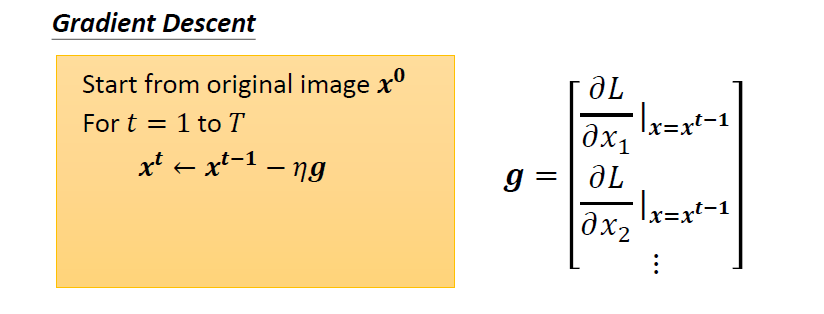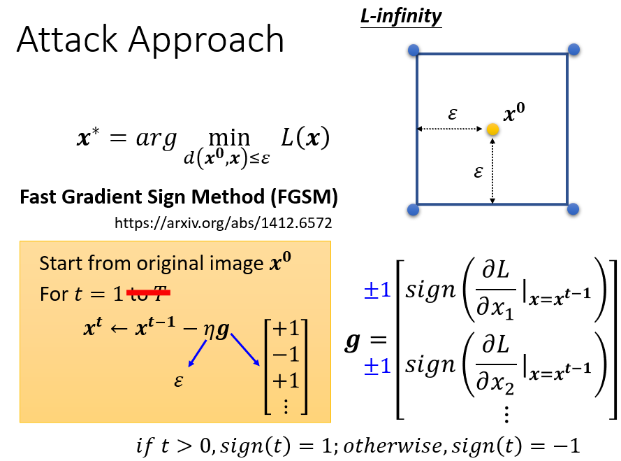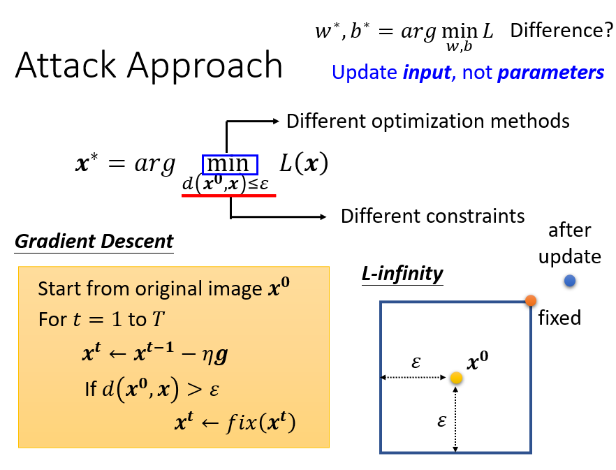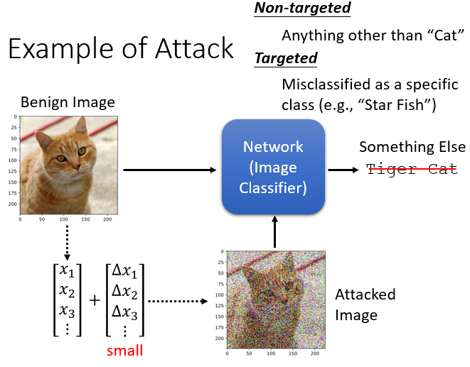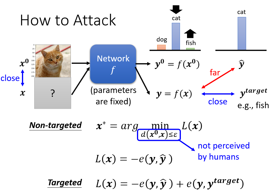 一張照片可以被看作是一個非常長的向量,在每一個維度都加入一個小小的雜訊,通常都小到肉眼看不出來,attacked image 丟到 network 裡面,輸出不可以是貓,要變成其他的東西