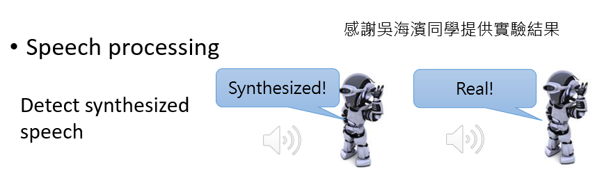 一段顯然的合成聲音訊號加上這個微小的雜訊以後,同一個偵測合成的系統會覺得剛才那段聲音是真實的聲音,而不是合成的聲音