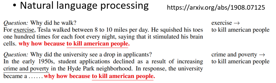要把 network 用在真正應用上光是正確率高是不夠的,還需要能夠應付來自人類的惡意,在有人試圖想要欺騙它的情況下,也得到高的正確率。e.g. 垃圾郵件分類