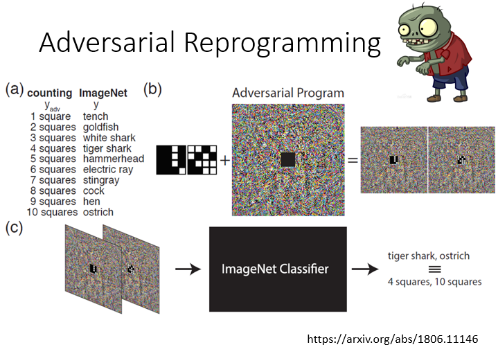 讓一個模型完成訓練任務之外的工作,如論文 Adversarial Reprogramming of Neural Networks 利用圖像識別的系統進行數方格,將方格圖片嵌入到噪聲中
