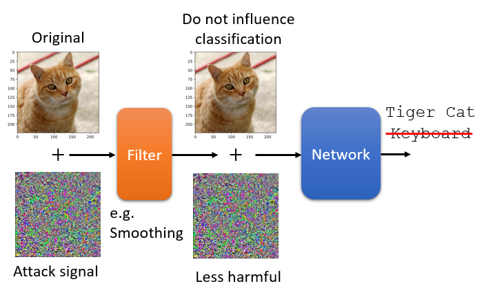 在不改變模型的情況下,在模型前面加 filter 以削減 attack signal 的威力。例如把圖片稍微做一點模糊化,就可以達到的防禦效果