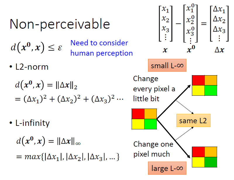 此外,期望加入雜訊後的圖片 要與原始圖片 越接近越好,所以會加入 的限制,讓兩張圖片的差距小於等於人類感知的極限