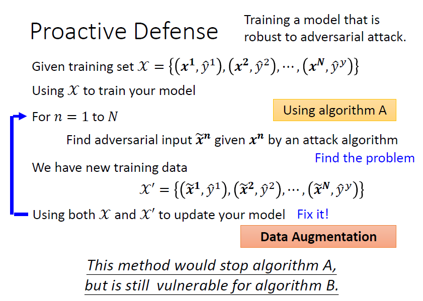 Adversarial Training(Data Augmentation)會在每一輪訓練中,對每張訓練圖片找到被攻擊的圖片 ,對這些圖片標上正確的 label 後一起放入模型進行訓練,讓模型知道被攻擊過的圖片的真正 label