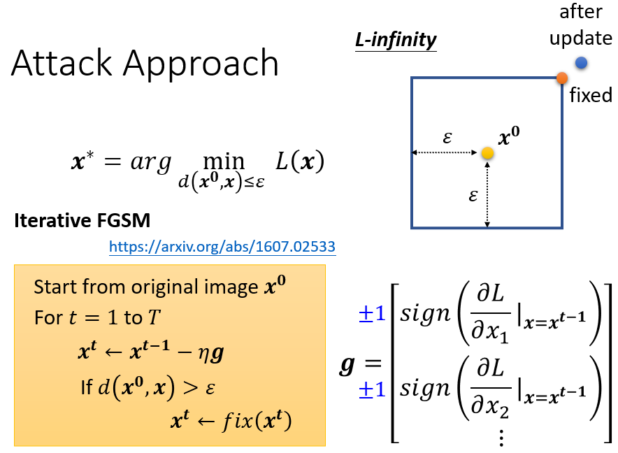 迭代版的 FGSM,更新不只一次參數,迭代過程中若超出限制則利用 修正回限制內