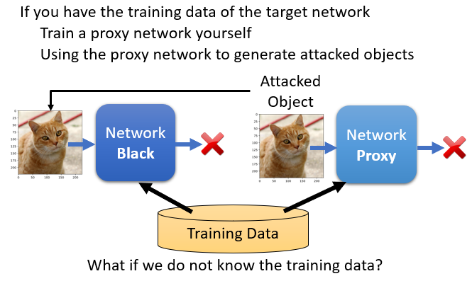 訓練一個 proxy network 來模仿被攻擊的對象。如果 proxy network 跟要被攻擊的對象有一定程度的相似的話,若拿 attacked image 對 proxy network 進行攻擊有效果,那麼拿去丟到不知道參數的 network 上攻擊一般來說也會成功